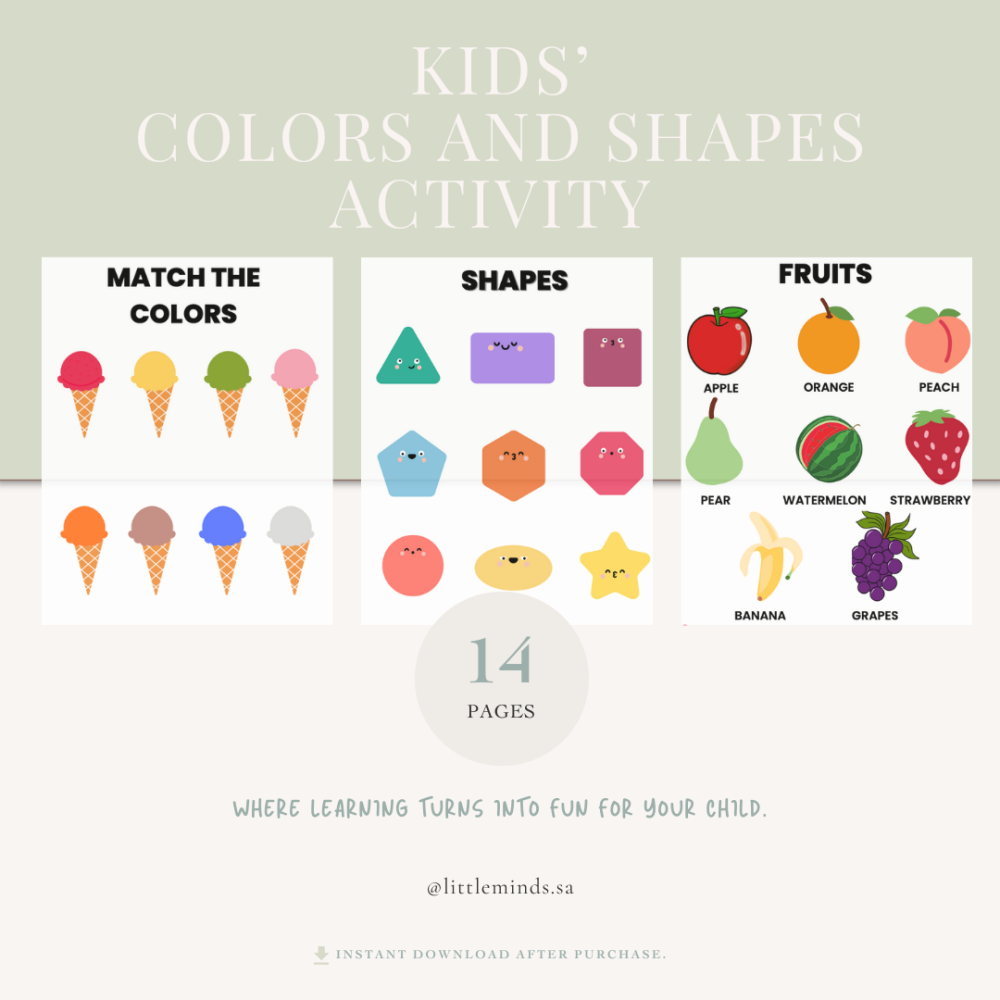 A fun educational pack that helps your child learn colors, shapes, fruits, vegetables, and animals in an interactive way.