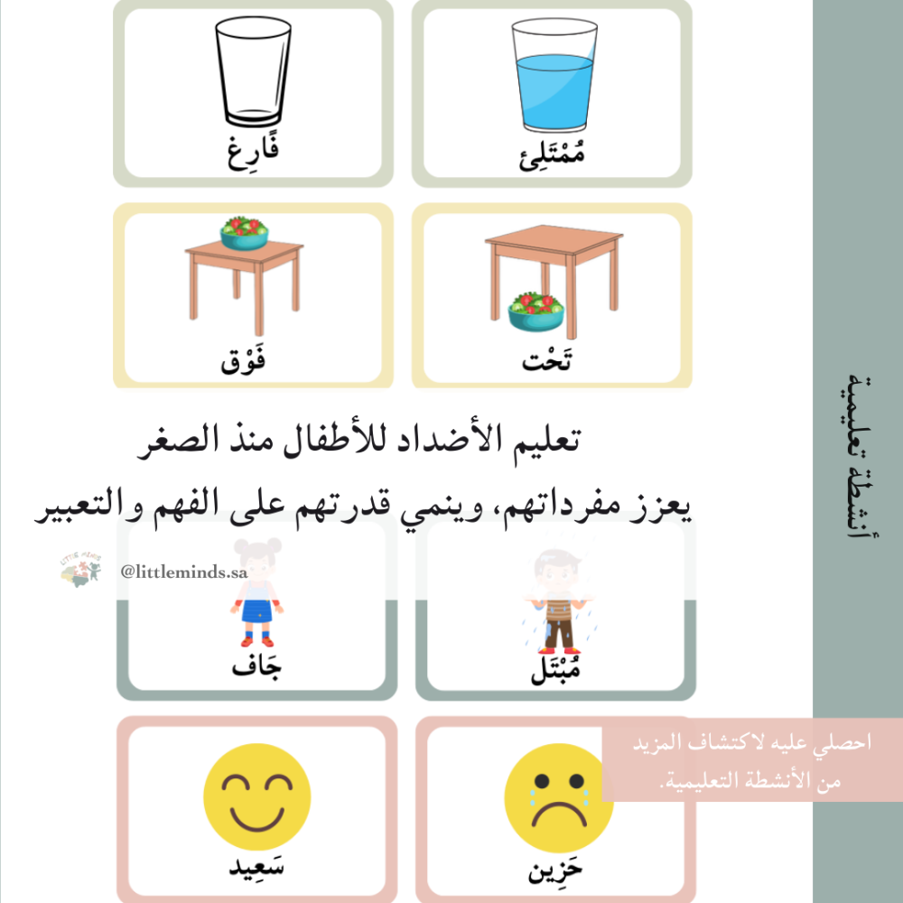 امنحي طفلك متعة التعلّم من خلال أنشطة وبطاقات تعليمية مخصّصة لتعليم الأضداد. يساعد هذا الملف على: